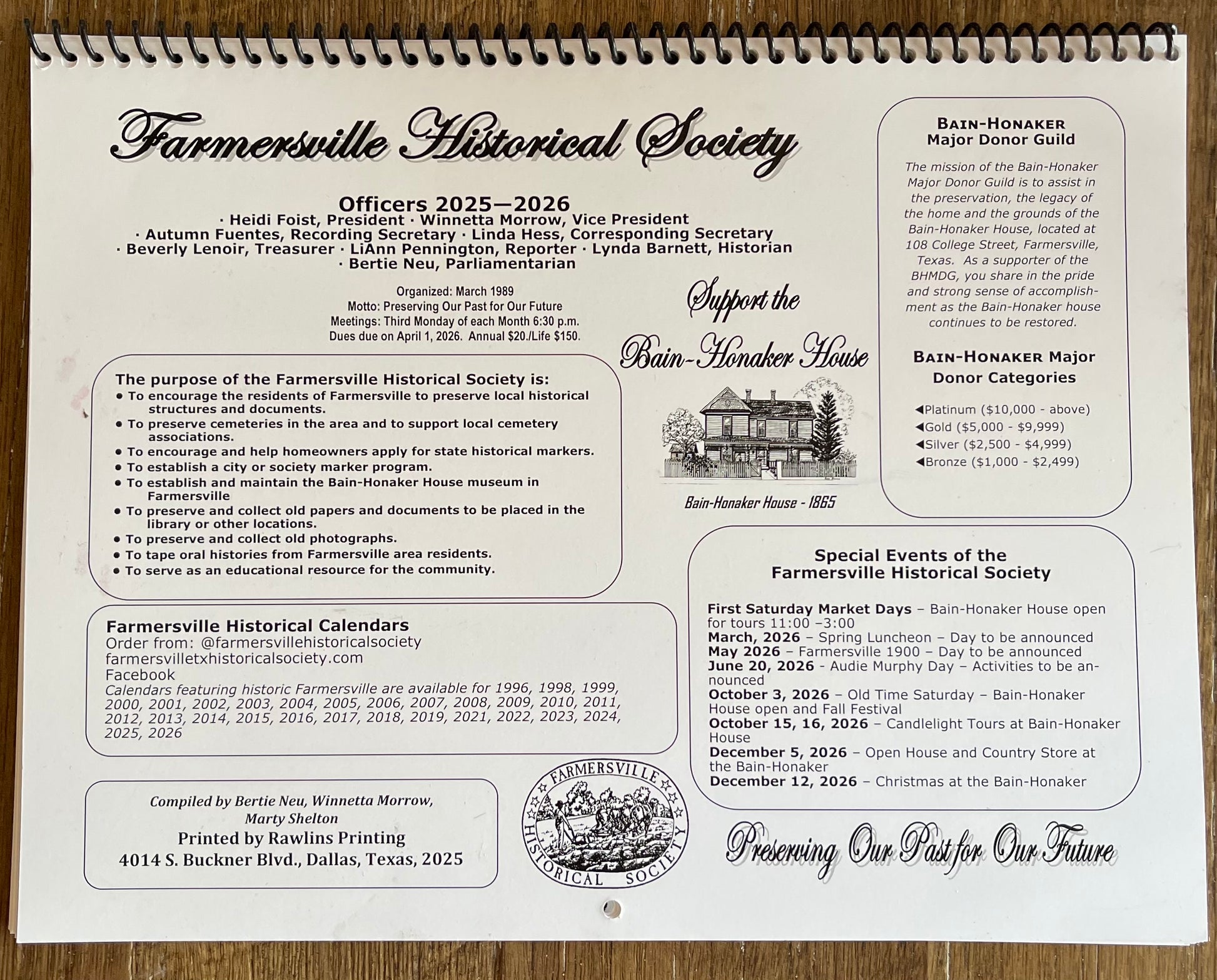 Every year our Society works hard on preparing a calendar that provides the history of our town of Farmersville and ALL proceeds go towards The Farmersville Historical Society to maintain and preserve the Historical Bain-Honaker House.
